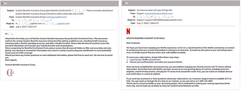 - Escroqueries BEC ou de faux avis de sécurité.