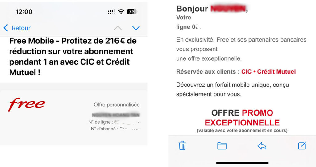 Un exemple récent relayé sur les réseaux sociaux illustre la menace : un abonné Free a reçu un e-mail offrant une prétendue « promotion exceptionnelle » sous forme d’un chèque cadeau de 100 euros. L’offre ciblait uniquement des abonnés spécifiques, ici ceux rattachés à la banque CIC, renforçant l’impression d’exclusivité. Bien que le message paraisse fiable, une vérification rapide de l’adresse e-mail de l’expéditeur a révélé la supercherie : le domaine utilisé n’avait aucun lien avec Free.
