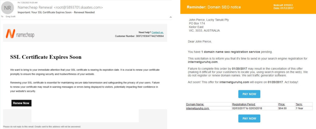 Un e-mail prétendument envoyé par un registraire de noms de domaine informe l’entreprise que son domaine expire dans les 24 heures et qu’elle doit payer immédiatement pour le renouveler. L’e-mail contient un lien vers un site frauduleux imitant celui du prestataire réel.