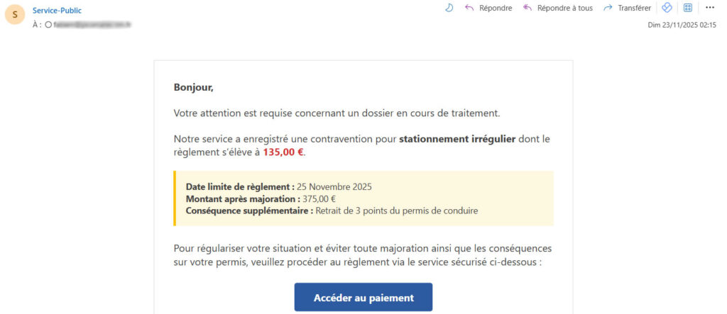 (…) stationnement irrégulier (…) 135 € à régler avant le 25 Novembre 2025