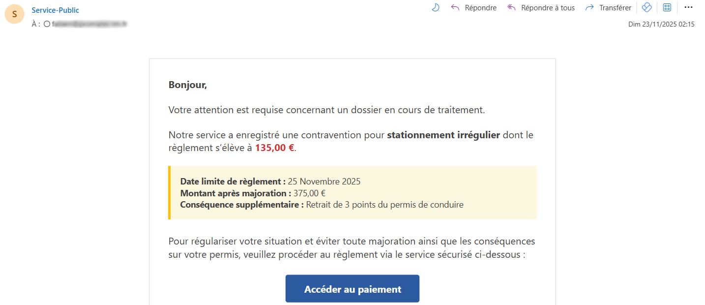 (…) stationnement irrégulier (…) 135 € à régler avant le 25 Novembre 2025